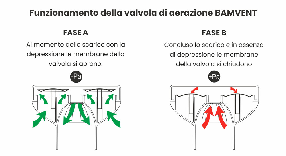 BAMVENT-110 è una brillante ed efficace soluzione per consentire il corretto e puntuale apporto d’aria all’impianto di scarico, evitando la fuoriuscita della colonna o di altro condotto verso l’esterno dell’edificio. All’interno del copro valvola vi sono 2 membrane che aprono l’ingresso d’aria nell’impianto di scarico soltanto in presenza di effetti depressivi generati durante l’evacuazione dei reflui. Una volta cessato l’effetto depressivo, le membrane ritornano in posizione di riposo senza alcun supporto meccanico, chiudendo di fatto l’accesso o la fuoriuscita di aria. L’apparecchio di ventilazione ha una capacità di 32 litri d’aria al secondo e, una volta installato, non richiede interventi manutentivi.